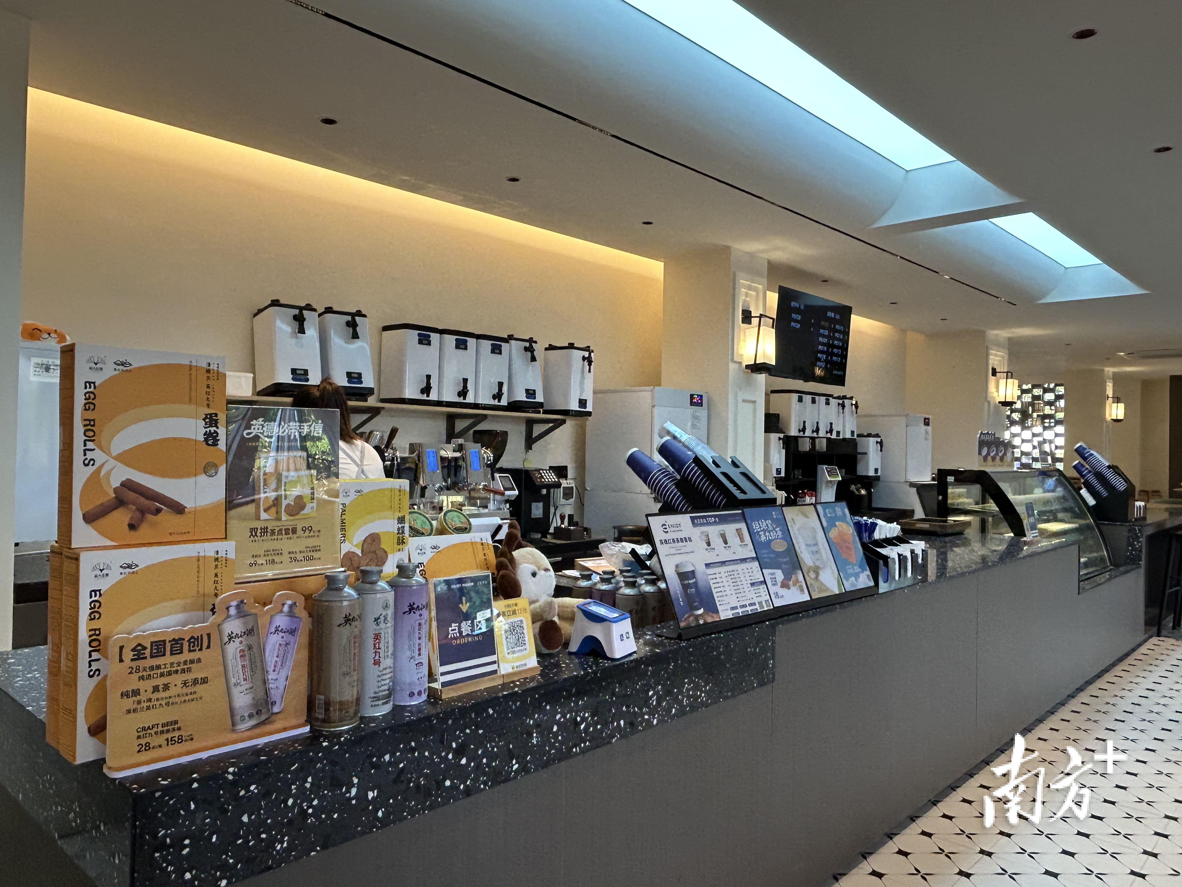 冬日的午后,暖阳洒在英九庄园连绵的茶山上,一行行茶树整齐排列,静待春芽萌发。山脚下却是另一番热闹景象——庄园茶咖内座无虚席,陈列架上茶食、茶文创与跨界产品琳琅满目。其中,“英九江湖”茶啤吸引了不少消费者驻足咨询。